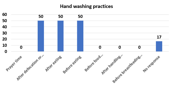According to the Centres for Disease Control and Prevention, something as simple as washing hands with soap can reduce diarrheal illness in people with weakened immune systems by 58%. Diarrhoea and pneumonia are the top two killers of children below the age of 5 across the globe. Thus, inculcation of good handwashing early in life may aid in the improvement of child development in some settings. Nearly 67% of the surveyed population reported that they only wash their hands when visibly dirty, therefore they are unaware of disease-causing bacteria that may be present on their hands as they are not visible to the naked eye. Thus, putting them at even higher risk of diseases which are transmitted through the faeco-oral route.
