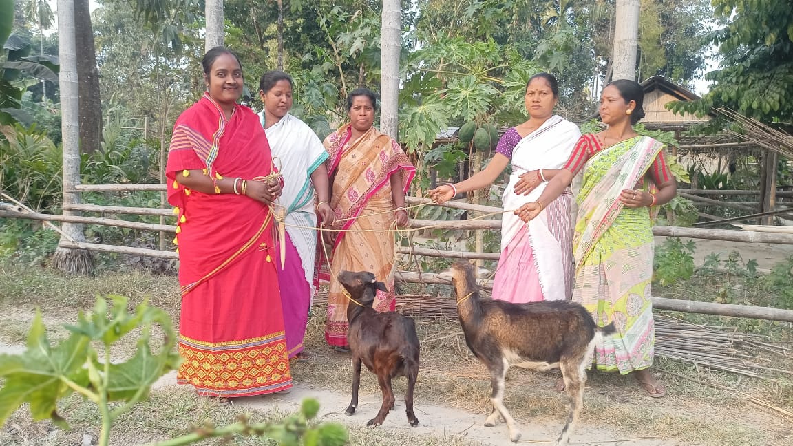 A chain of help is practiced by the SHGs in rural villages that were affected by the Covid-19 pandemic in 2020. The Rupali Self Help Group of Lakhipur village helped their neighbour by giving away a goat and some ducklings, through the support they received from Covid response.