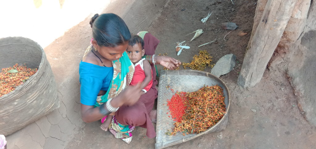 Forest and Medicinal Herbs: The traditional forest dwelling communities like the Madiys have always been treating their ailment through herbal medicines which is the legacy of their ancestral knowledge. The big tree-lock are used for Fencing the homestead land. The abundance of such herbal medicines is available in the forest, families collect them and process before selling in the market. The red seed in Photographs is being separated from its fruits and will be sold for Rs 350 only to the middle man the Baniyas. Dwelling in the Lap of the Forest land the Abuj Madiyas are getting together monthly and discussing on their rights on resources in the forest which has historical ownership evidence but when it comes to legal ownership land document as majority of them are unaware – however in recent times they have been oriented by their leaders (some educated and enlightened the young generation Abuj Mahadiya) and so the sense of legal ownership is gradually percolating .