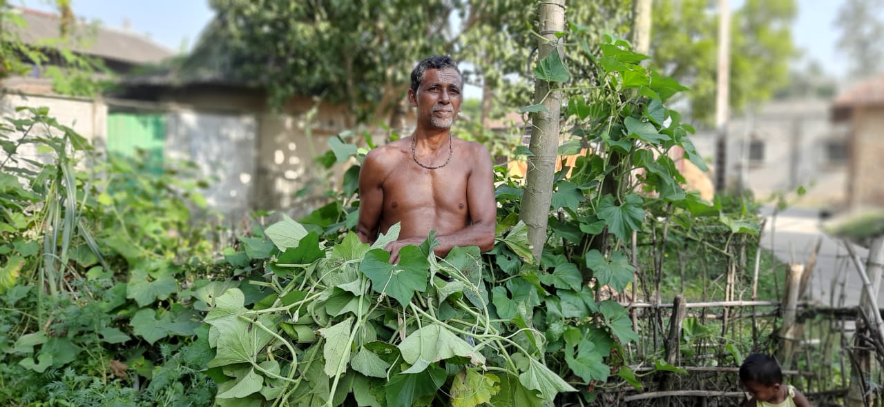 Mr. Madhusudan Bairagya, resides in a remote village in Purba Burdwan district of West Bengal. He has 6 members in his family. The main source of livelihood is agriculture. He attended a training on ‘Organic farming’ conducted by ABSK. Through this, he understood the gravity of hazardous chemicals and pesticides used for growing vegetables. He realized that the excessive use of chemicals and pesticides renders negative impacts on soil health and ecology. As a vegetable vendor, he faced the problem of the shelf-life of vegetables which was one or two days only with pesticides whereas organic vegetables last longer and are health friendly.”