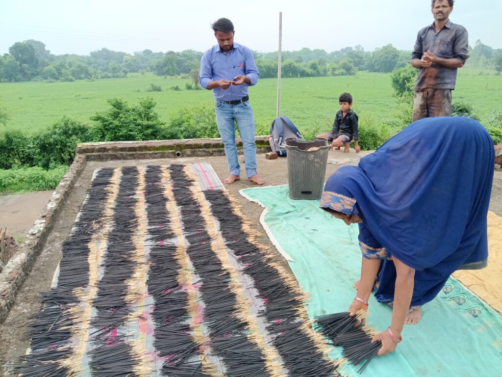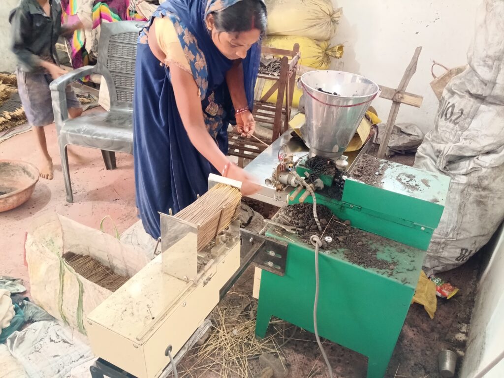 With encouragement from SAFBIN, Bharti connected with a wholesaler willing to provide training and market access for her new venture. A community worker facilitated a partnership with a wholesale incense stick trader in nearby Sagar city, who offered free training. Over three intensive days, Bharti learned how to produce incense sticks using machinery.