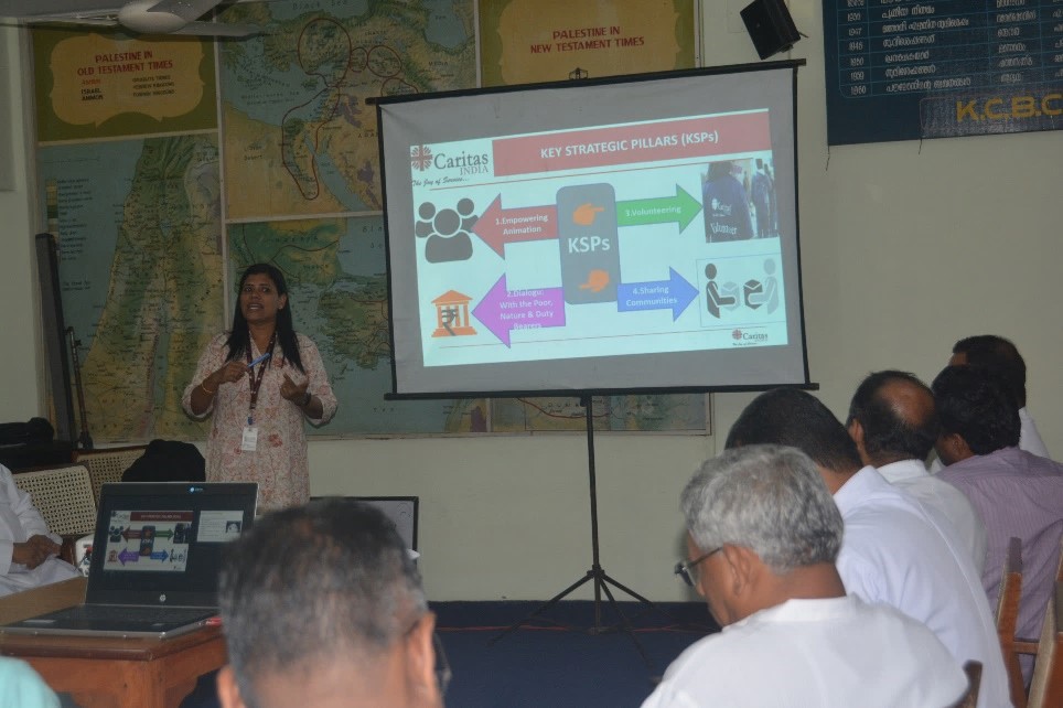 Presenting the last quarter results of Navajeevan programme, Larina Fernandez, Programme Office of Caritas India shared about the progress made in conducting Post Disaster Risk Assessments at the village level, the formation of village development management committees (VDMCs), and Disaster Risk Reduction (DRR) sensitization and trainings. for presenting the cluster-wise presentation of Navajeevan programme. Caritas India has initiated Navjeevana programme across the districts of Kerala in coordination with the Diocesan partners to build disaster resilient communities by developing village disaster management committees.