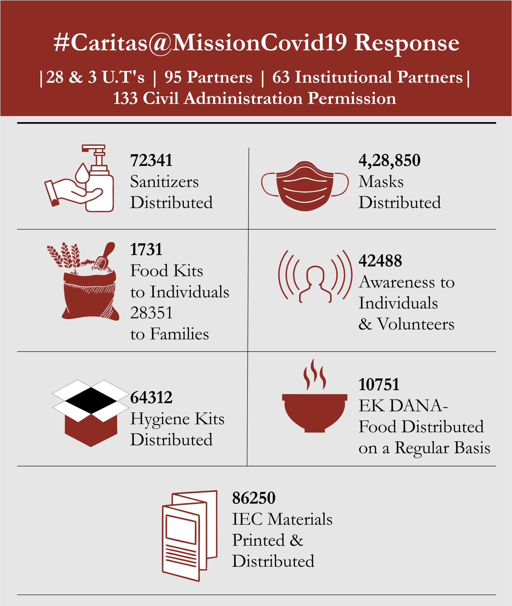 Post lockdown period, Caritas India and partners through effective approaches of its key pillar of Dialogue have got in touch with various stakeholders such as Government Hospitals, Municipal and District Administration, Local Panchayats, ASHA workers and CSRs to continue its efforts with deeper impact. As a result, even amidst strict regulations and limitations, through the approach of Volunteering and Sharing Communities the staff and the volunteers have been able to distribute sanitation kits – consisting of sanitizer, soaps and masks and food kits – consisting of raw/cooked food materials to the vulnerable and extremely poor communities such as slum dwellers, street dwellers who live on city peripheries. Till now, Caritas India has reached around 28351 families through its partners and 10751 families are fed on a regular basis all over India by our Partners.