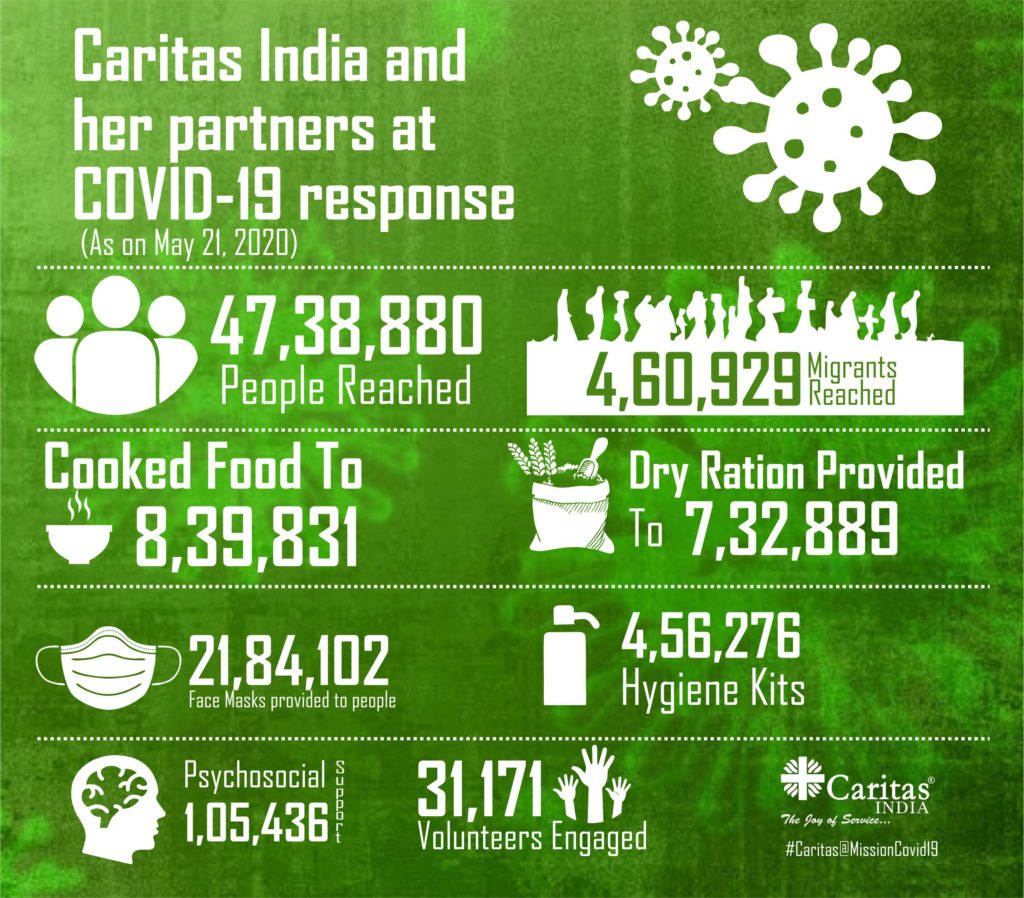 The coronavirus COVID-19 pandemic is the defining global health crisis of our time and one of the greatest challenges to mankind. Since its emergence in India, the virus has spread to every state and cases are rising every day. In this background, Caritas India has been taking lead in the emergency response by not leaving a mile unturned. While addressing the question of misinformation and catering to the psychosocial needs of distinct age groups and socioeconomic conditions, Caritas India through its national emergency helpline has managed an effective public health communication. This pandemic has led to the unemployment of many people from the weaker segments, so the pressing need of the time is to fight hunger and starvation. Partners continue their assistance and contributions during this pandemic from day one to this day. A more pronounced focus on community kitchen initiatives for government staffs and health workers, migrants crossing the border, transgenders, HIV positive people, cancer patients, tribals and gypsies, elderly people and persons with disabilities, has been observed this week. Caritas India has not only come up with effective strategies for helping individuals in dealing with social and physical distancing, but also tried to bridge the inequalities and reduce stigma, prejudice and discrimination that exists in the society.