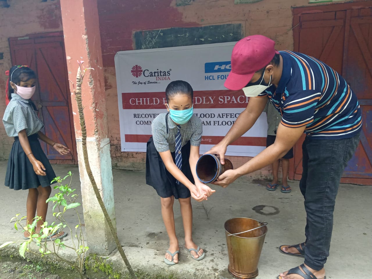 The main objective of establishing the CFS is to provide and extend support in the form of Learning Centers, carrying out extracurricular activities & sensitization programmes etc and deliver important activities on child wellbeing. The centre that was inaugurated at Chelajanmiri village is the first one out of the other 10 centres to be established for the children of the area. In each centre, committees have been formed to monitor the process and functions of CFS of the area and also 2 volunteers per centre have been enrolled by Caritas India under the project to conduct various educational/recreational activities with the children who are distressed due to the ongoing pandemic and floods by maintaining all the covid19 protocols. Children were also given awareness sessions on Covid19 under which the seven steps of proper hand Washing technique was shown to them. Proper Mask wearing technique, Importance of Social Distancing and also awareness on covid19 symptoms/precautions were also discussed and demonstrated at Child-friendly Space.