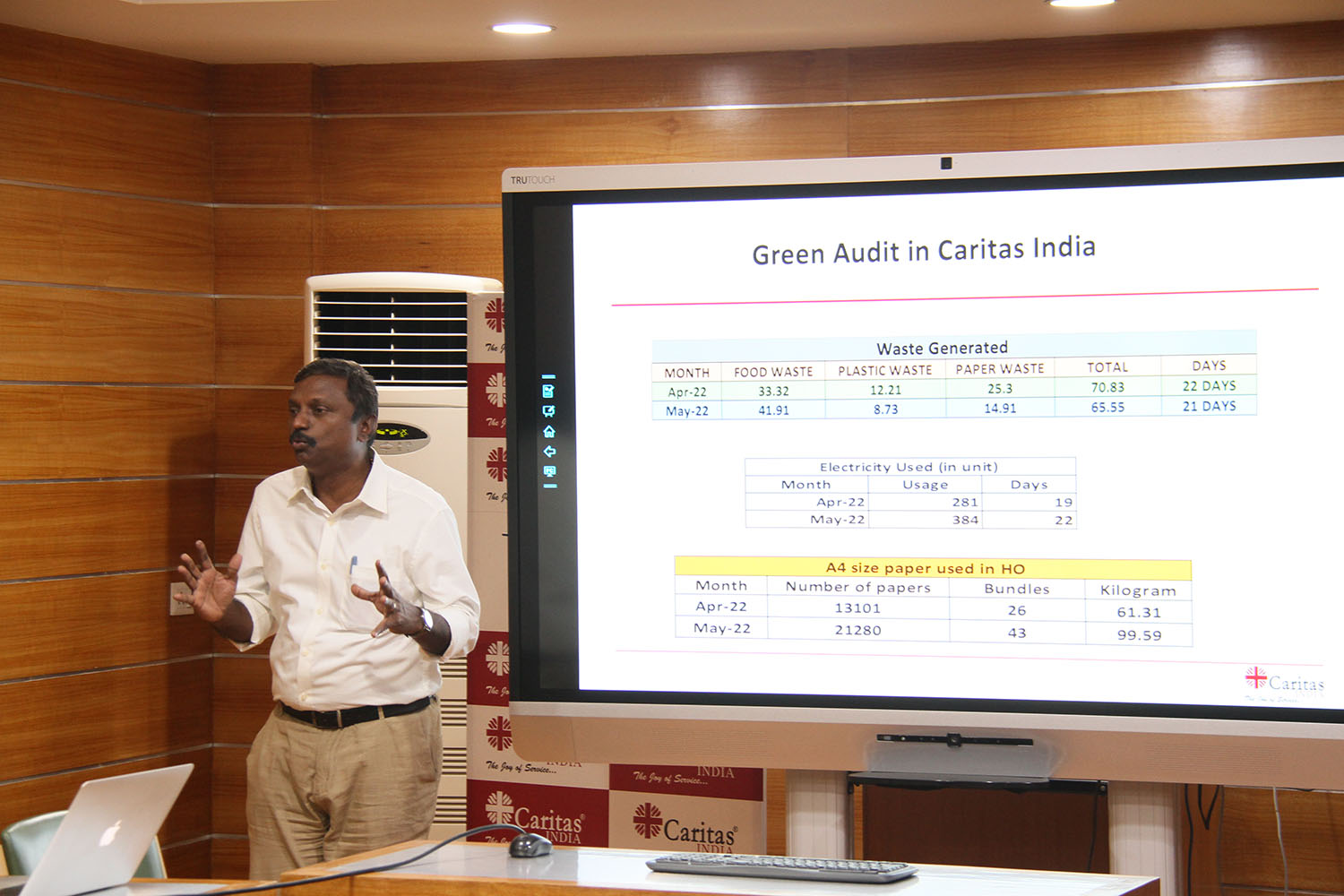 The programme then transited into introspection on the recently conducted “Green Audit” for Caritas India head office. The Green Audit was a two-month-long exercise, carried under the leadership of Ms Shimray,  Lead – Training & Development – CIDAL, that aimed to delineate the exact number of energy consumption and overall wastage in Caritas India’s Head Office.