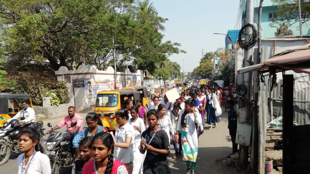 They were joined by 8 faculty members thus making the total number of participants as 582.  Starting from the college campus, walking through the Madhavaram – Perambur arterial road, the rally covered 4 KM on 5th March 2019. The campaign was jointly flagged off by  Dr. Hanifa Ghosh and Caritas India State Officer Dr. John Arokiaraj.