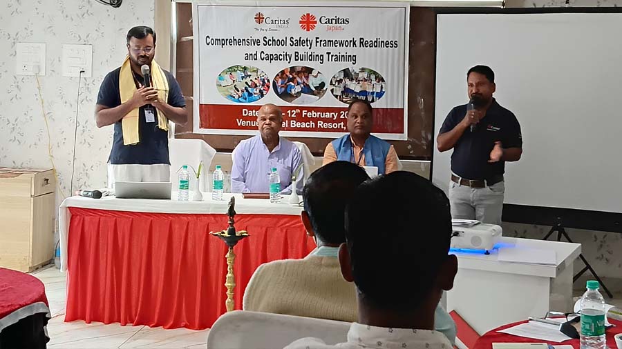 Fr Benny Edayath, Assistant Executive Director of Caritas India, opened the programme by underlining the urgency of institutionalising school safety in vulnerable geographies. Mr John Lima, programme associate – HADRR, introduced the Comprehensive School Safety Framework and its operational components. The technical sessions were facilitated by Mr Bapi Satyajit Sahoo, disaster risk reduction professional associated with Odisha State Disaster Management Authority, who guided participants through risk assessment tools, planning templates and real-life response scenarios.