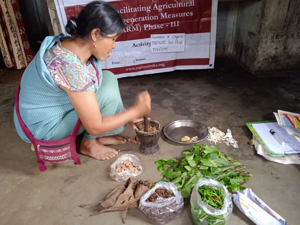 Caritas India with the support of SSC selected this village under the FARM Northeast programme in the year 2020 with an objective to revive traditional farming. The programme provided practical farming trainings and encouraged chemical-free farming in the kitchen garden to secure healthy food. During the consultation meeting, the community expressed its frustration with the difficulty of obtaining organic manure and organic bio fertiliser and asked SSC to provide one-day training on organic manure and bio pest repellent.