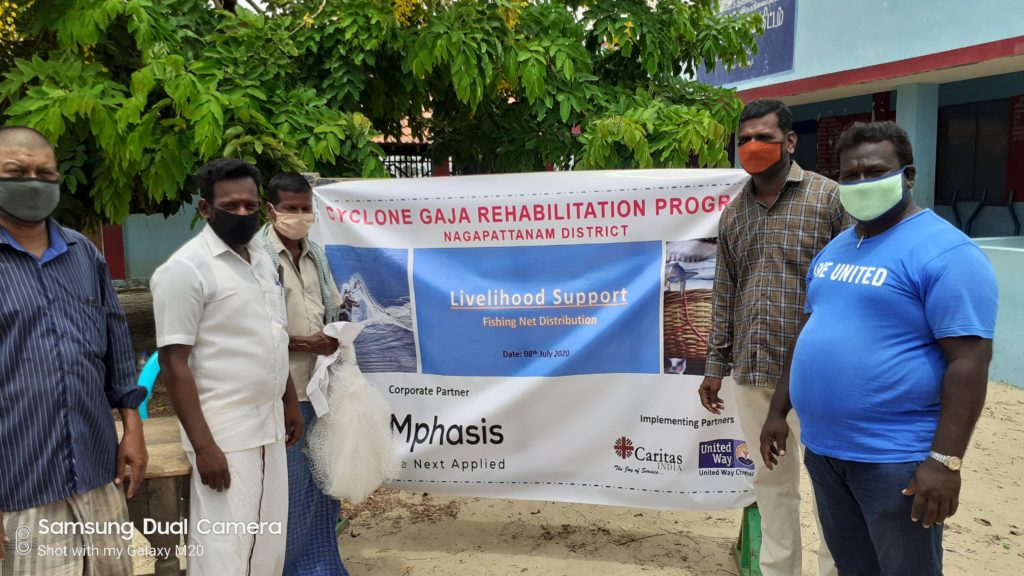 Caritas India with the support of United Way Bengaluru/Chennai played the catalyst role. Thanks to the generous contribution of Mphasis. Caritas India response was led by its manager, Dr. John Arokiaraj along with Mr.Vijay Senthilkumar of United Way Chennai. The accompaniment support of field officer Chellapandi and local school headmaster cum philanthropist Mr.Anand helped in capacitating the local communities on  Participatory Disaster Risk Assessment (PDRA) tool. A livelihood assessment tool was used in this village to identify beneficiaries and initially goat rearing, poultry farming,  salt retail business and refurbishment of shops were proposed. Later on, further interaction among community members made them come up with a swift recovery plan proposing support for fishnets to 44 families, goats to 28 families,  petty shop support to 14 individuals and assistance for the refurbishment of 10 shops.