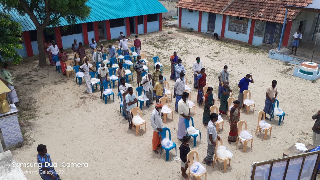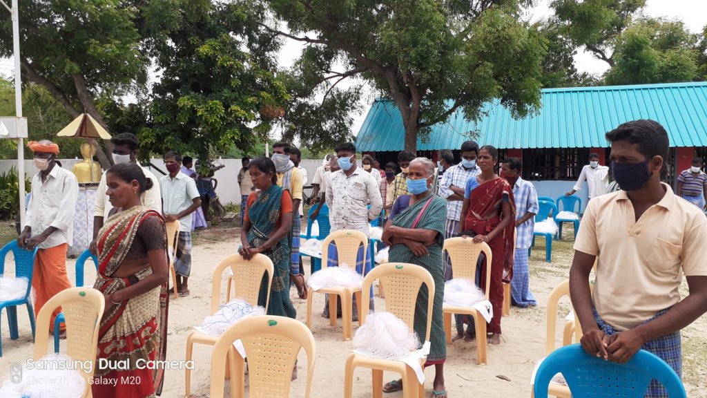 On the 8th of July, 2020, the 44 beneficiaries under fishnet livelihood assistance project assembled at the local school campus and were seated following the social distancing protocol. This event took place in the presence of Avarikadu Panchayat President- Mr.Lalitha Kalaiselvan and Mr. Aanand where fishnets were distributed. This occasion was also used to raise awareness on COVID 19. The arrangements were made by Chellapandi.