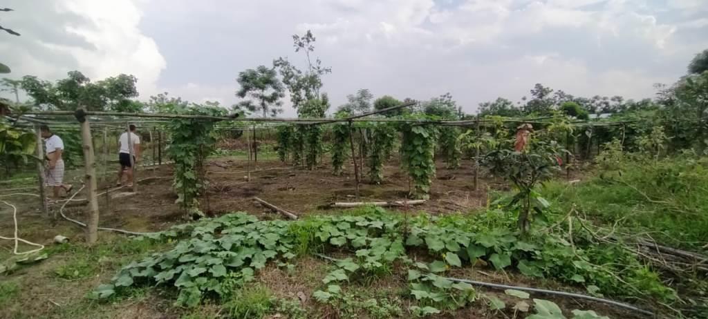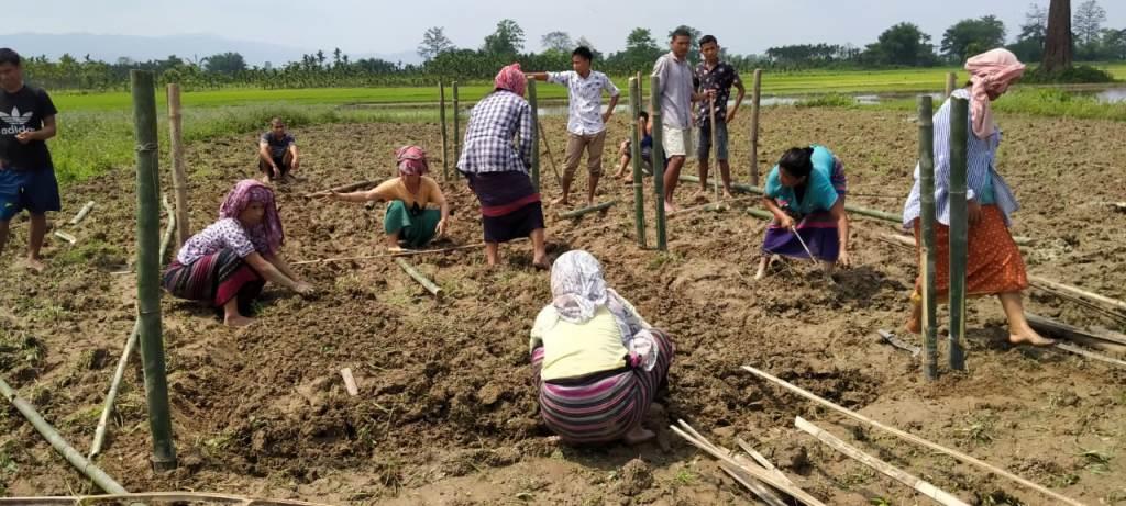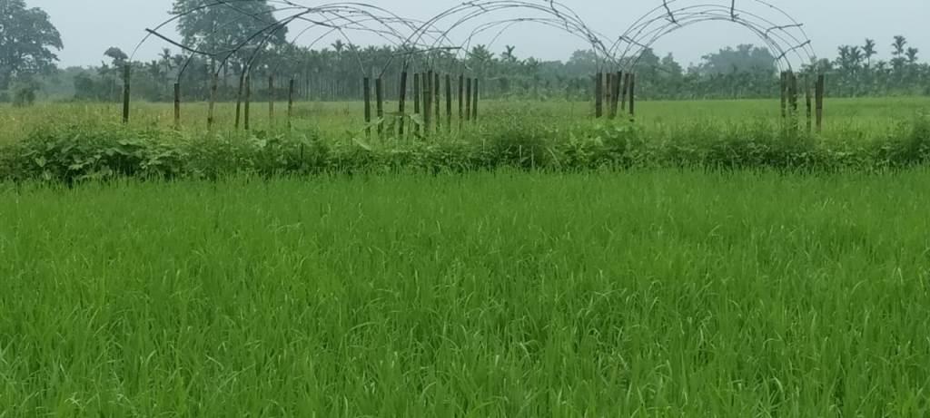 The cultivation was planned on the ground and on trellis simultaneously to get more in the same season. The farmers used 1½ bigha (0.68 Acres) of land to start this climate-adaptive practice in the month of May 2022. The crops grown on the more than 5 trellises include pumpkin, bitter gourd, bottle gourd, ash gourd, and cucumber whereas paddy, chilli, okra, taro, maize and local coriander were cultivated on land. Thirty members of the farmer club work 4 days in groups for the preparation of field ploughing, levelling, sowing of seeds and setting up trellises.