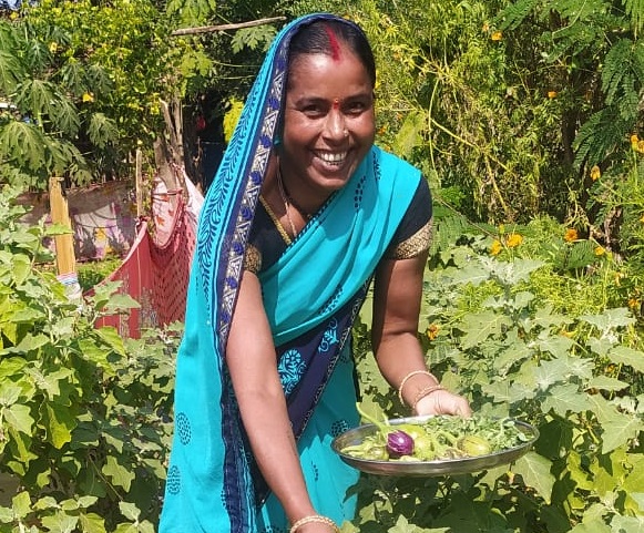 Within a month the plants started growing and bearing flowers. Recently during her follow-up visit, Laxmi was glad to see that Vimala has started harvesting vegetables from her nutrition garden and including in her family platter. Her children’s health has also improved. Vimala happily shared that “We often skipped purchasing vegetables from the market as they were high-priced. But now we are growing our own vegetables and I prepare a variety of delicacies for my family.” They also have got guava, custard apple, papaya and lemon growing in their vicinity which is taken care by her elder daughter.