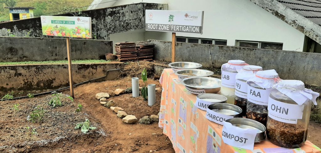 Training and Practical Demonstration of Garden of Eden and Root Zone Fertigation model: The participants were trained on the present situation of the safety of the food and the health disasters caused due to the intake of chemical and pesticides residues in food. To ensure food safety and security, it is high time to promote natural farming of vegetables and fruits. Garden of Eden is an innovative way of promoting Family Farming using organic growth promoters which can be prepared with local resources. The practical demonstration of this model was done with the active involvement of the participants who are basically the smallholder farmers. They were trained on the process of setting up the model followed by the demonstration model in MIDS campus. This model is done by demarcating a rectangular plot of 5 feet width and 10 feet Length. 4 inches of topsoil is taken out and put on one side of the plot and divided this plot into 4 small plots of 2 feet length. Soil from the first plot is taken out to a depth of 0.5 feet and put outside and filled dry leaves in the first plot. Soil from the second plot is then taken out (0.5 feet) and put it on the first pit which is filled with dry leaves. Then filled dry leaves in the second plot and out the soil taken out from the third plot (0.5 feet) and put it on the second plot. Filled dry leaves in the third plot and taken out soil from the fourth plot and put it on the third plot which is filled with dry leaves. Continue the same process in the fourth plot. Later filled dry leaves in the fifth plot and filled soil which is taken from plot 1.