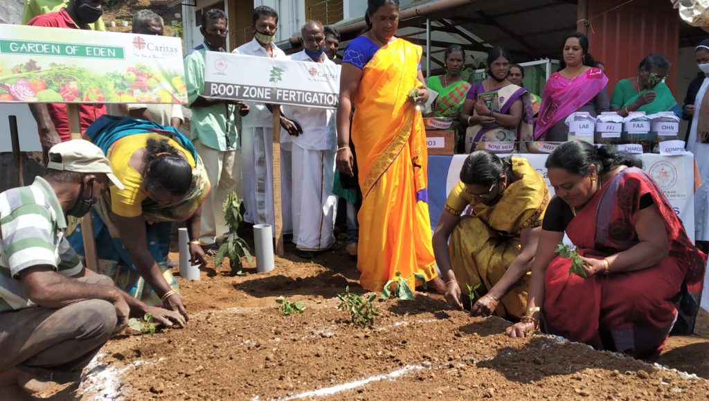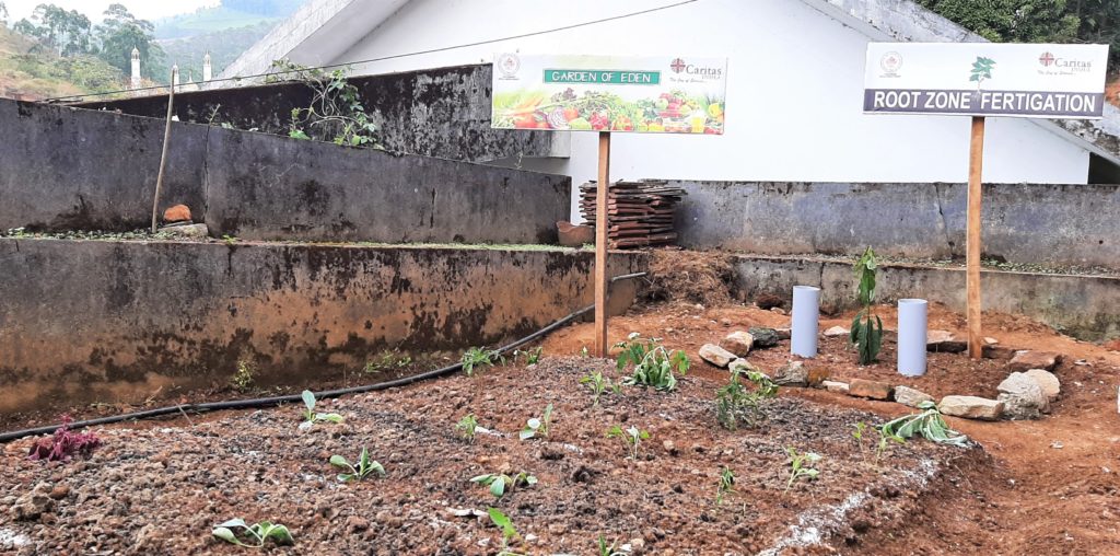 Practical demonstration of Root Zone Fertigation (RZF) technique in tree planting: Caritas India is introducing a new technique of planting tree saplings with minimum use of water and necessary nutrients. The participants of this training were provided with the inputs of the process of setting up Roof Zone Fertigation models and a demonstration model was set up on the campus for replication by the participants in their respective locations. The innovation of root zone-based fertigation practice provides water and manure to a depth of 2 to 3 feet which is difficult in surface irrigation methods. This technique involves creating a permeable zone around the root zone of the plant providing a favourable environment in the Rhizosphere (the plant- root interface) by facilitating fertigation (water and nutrients) is being transferred to the root zones at different levels. Rhizosphere part of the plants is the hot spots for microbial diversity. Water use efficiency will be ensured through this technique and helps in reducing evaporation as the water and nutrients are given directly to the subsurface root zones.