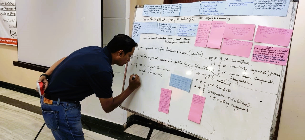 Mr. Pradipta Kishore Chand (Thematic Lead for Climate Adaptive Agriculture and Food Sovereignty – Caritas India) took the second-day session key topic of “Food and Nutrition Security and Livelihood,” which the workshop participants unanimously agreed should be pursued further as a theme for the new proposal. The participants gradually created the Goal, Outcomes, Objectives, and Activities for the chosen issue, and gave it the shape of logical framework analysis.