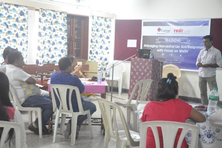 A 4-day training was facilitated by RedR India to train Caritas India partners’ staff on “Managing Humanitarian Aid with Focus on WaSH” in Delhi from May 28-31, 2018. 21 Participants from East, North and South zone learned the principles of humanitarian practice and the nature of work in emergency response with a specific focus on WASH.