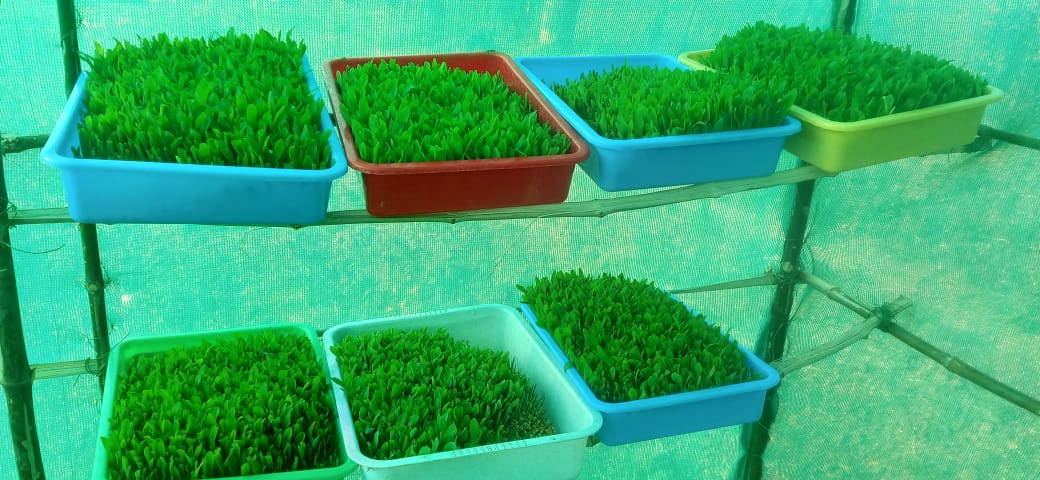 Feeding green fodder ensures productivity in animals. Though India is the top producer of milk in the world the per capita production of animal is low because of insufficient livestock feed, fodder which affects the production and reproduction. Getting fresh green fodder for domestic animals every day is a question in the areas where there is no assured rainfall and no irrigation facility. Especially the small and marginal farmers and agricultural labours depend on the small unit to meet their everyday expenditure. Hydroponics is a method of growing plants in water-based solution without soil to produce quick and nutrients rich fodder from Maize, Ragi, Bajra, barley, oats, Cowpea and Horse gram.