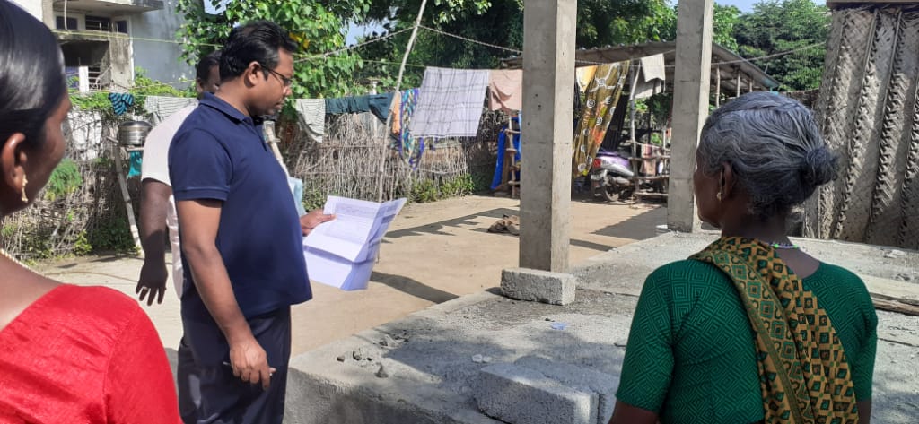 The monitoring team while interacting with the community observed different dimensions of community participation. They have been very cooperative during construction by vacating their houses, cleaning, leveling and preparing the site ready for construction. 10 beneficiaries are deployed as laborers in construction work and thereby they earn their livelihood. Periodical meetings are conducted for the beneficiaries to inform about construction of beam, column details and how to do curing (by water) daily. After construction of the plinth beam, the beneficiaries themselves are filling the soil immediately which speed up the construction of floor PCC work. Some women beneficiaries provide lunch, tea and snacks for the labourers which fetch them some income during construction work.