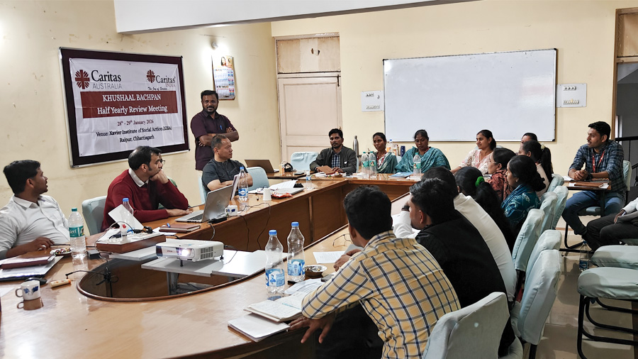 The Half-Yearly Review Meeting held on 28 and 29 January 2026 brought together the assistant executive director, Khushaal Bachpan lead, MEAL lead, programme finance associate from the head office, state programme finance associate, state programme associate, district programme associates, and community educators. The meeting opened with a prayer, introductions, and a keynote address emphasising collective action for child well-being. Fr. Benny articulated a clear vision for positioning Khushaal Bachpan as a key focus area of Caritas India’s work on child rights and child-led community development, stressing that programme quality must not be compromised.
