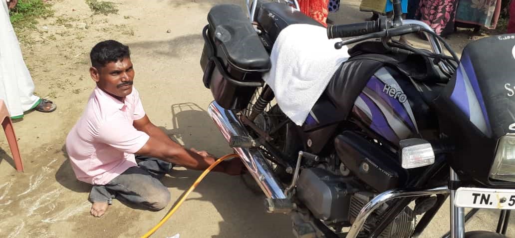Unfortunately, when he commenced the business, obstacle came in the form of caste. The person who lent the land had made Rajalingam vacate the place and in the same area, the caste man has started a similar business. Undeterred by this betrayal, he had shifted his shop to  Nagapattinam – Thirukuvalai main road  5 KM away from the current location. “In a day, on an average, 80 customers visit my mechanic shop either for filling air or repair of the vehicle and I am able to earn Rs.500/-  Rs.700/-. I am confident that my business will flourish in the coming days” says this confident mechanic. Along with the bunk shop, Caritas India supported  Rajalingam with capital investment to buy compressor, tools and water wash machine.
