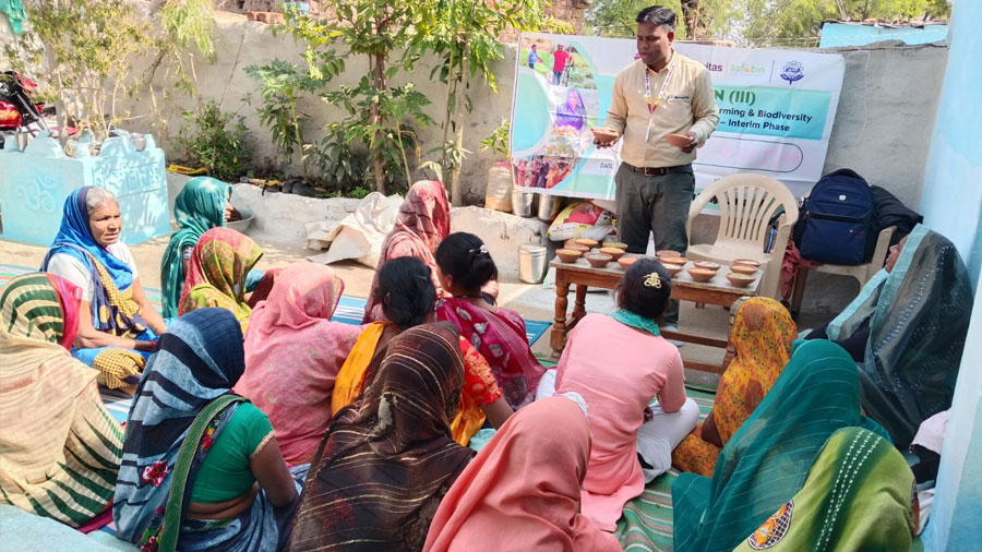 In Surajpura, a participatory group discussion involving 48 villagers, including lead farmers and SHFC members, deepened engagement. Topics ranged from seasonal pulse varieties and organic crop health management using Dasparni Ark, Jeevamrit and neem oil to market access and value realisation. The dialogue strengthened both agronomic knowledge and economic planning.