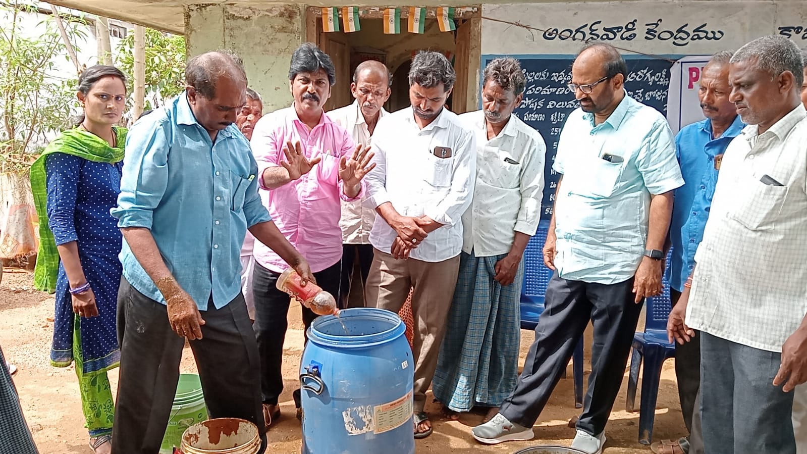 On a pilot basis, the team has distributed green manure seeds for mulching such as Green gram, Black gram to the five farmers in the Kommulavancha Village by the Agriculture dept under the Scheme Soil Mulching. M.Kalavathi, a progressive farmer cum SHG member received the vegetable seed which was used for the kitchen garden for the family use. LMSSS staff has demonstrated the process of making Jeevamrutham which is an organic growth-promoting solution and a good substitute for chemical fertilizers. Jeevamrutham is made of two words – Jeeva and Amrutham. Both the words are derived from Sanskrit. The word “Jeeva” means a living being and “Amrutham” means the elixir (medicine) up to extend the life of the soil fertility. It is a very good source of nutrients to the growing plant, which is very essential for plant growth and good yield while improving soil health. The microorganisms which are present in the soil are responsible for increasing the fertility of the soil and at the same time productivity of the crops.