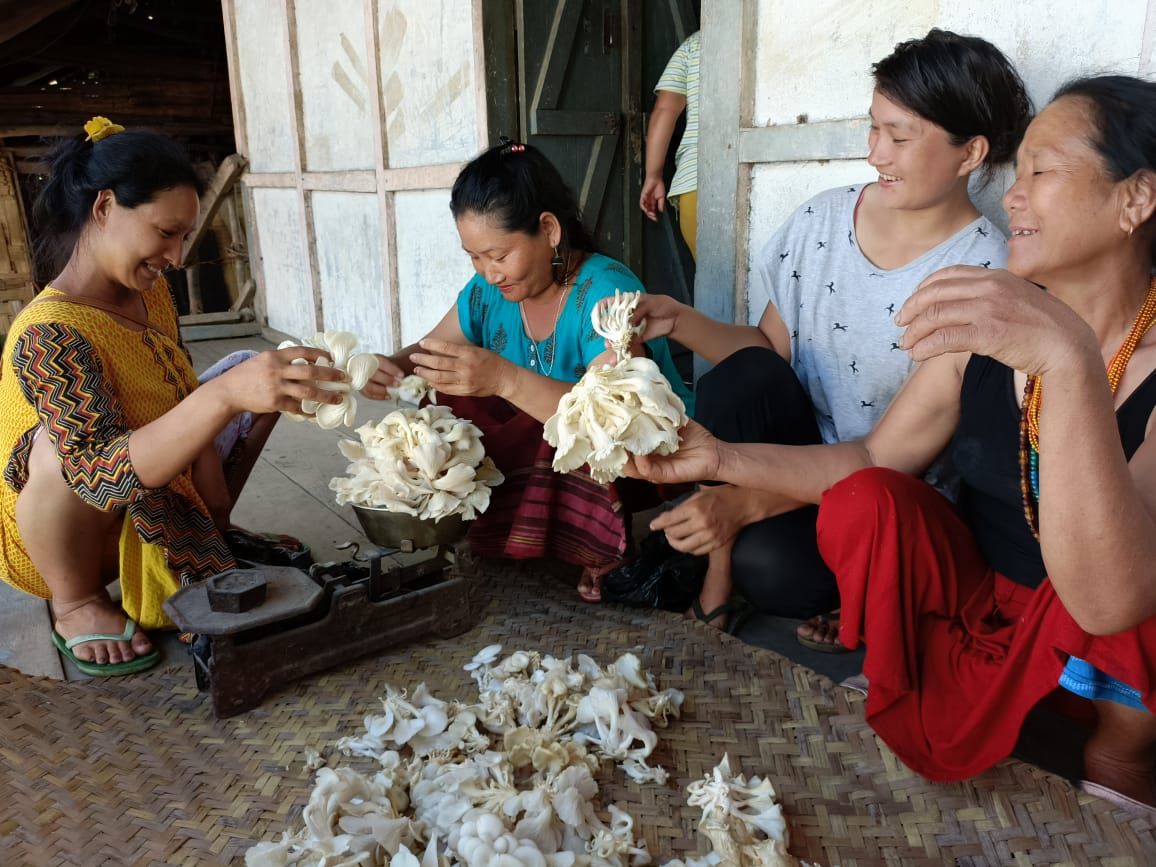 During the baseline study, it was found that farmers use paddy, millets and maize straw for feeding animals. To make use of straw and generate alternate income from waste; oyster mushroom production was introduced to the farmers of the project area at Sagalee block in Arunachal Pradesh since mushroom cultivation has gained recent traction in Arunachal Pradesh owing to its low input cost. The favourable climatic conditions have provided ample opportunities for the farmers to make mushroom farming as a business for better sustainability.