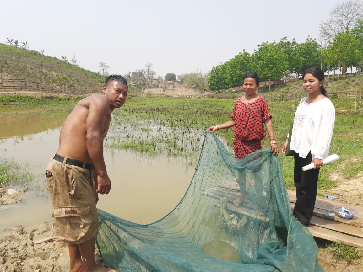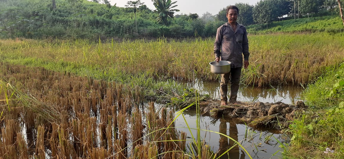 The FARM team of Jirsong Asong (JA), a Caritas India partner has trained the farmers on Paddy cum Fish (PFC) cultivation during the exposure visit to TSSS. Ms. Venika Hansepi, Animator JA while visiting the fields of Babu Teron from Jorlep Teron village in the district suggested Babu go for PFC. Taking note of the suggestion Babu Teron initiated Paddy cum fish cultivation in his field in the month of July 2021. He converted a piece of wasteland into a model Paddy Cum Fish Culture. Babu is among those lead farmers in the FARM programme who is involved in the cultivation of Banana, Pineapple, Arecanut, Seasame, Ginger, Chilli, varieties of Yam, Tapiocas and lots more. “I keep cultivating the crops to support my family and by the grace of God this helped me through the peak of lockdown period in 2020”, said Babu.