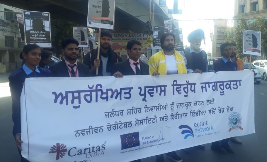 Caritas India’s initiative on Awareness Campaign against Unsafe(Irregular) Migration is an attempt to spread awareness on the consequences of Unsafe (Irregular). On its first of its kind roadshow, Caritas India organized one day march with its local partner Navjeevan Charitable Society in Jalandhar City from Desh Bhagat Yadgar Hall to BMC chowk and vice versa under the awareness Campaign on unsafe migration.
