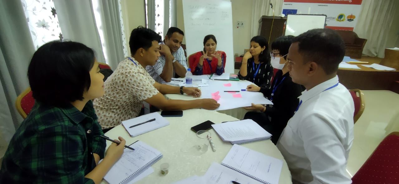 Mr. John Condon, an expert in the field of protection mainstreaming brought in a very rich thematic experience to facilitate the whole training program around the protection principles of Safety, Dignity and Access.  The program team members from state-based partner organisations of DSSS, Imphal and ZEP, Aizawl participated in the training. CRS state representatives also attended the event. Mr. Thomas Preindl and Mr. Sunil Simon from Caritas Austria steered the anchoring of this training viz-a-viz importance of the theme and its field applicability.