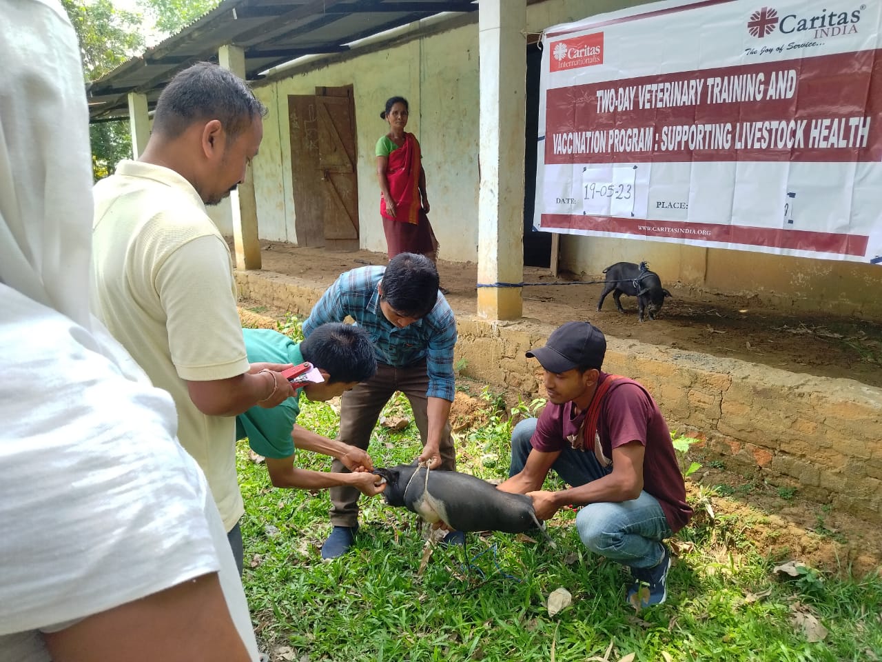 As part of the livelihood support provided, 424 households in the target areas have received livestock, which includes pigs, goats, and poultry. Recognizing the importance of ensuring the health and well-being of these animals, Caritas India, in partnership with the Veterinary Department of the Government of Assam, initiated a comprehensive veterinary training and vaccination program in the West Karbi Anglong district.