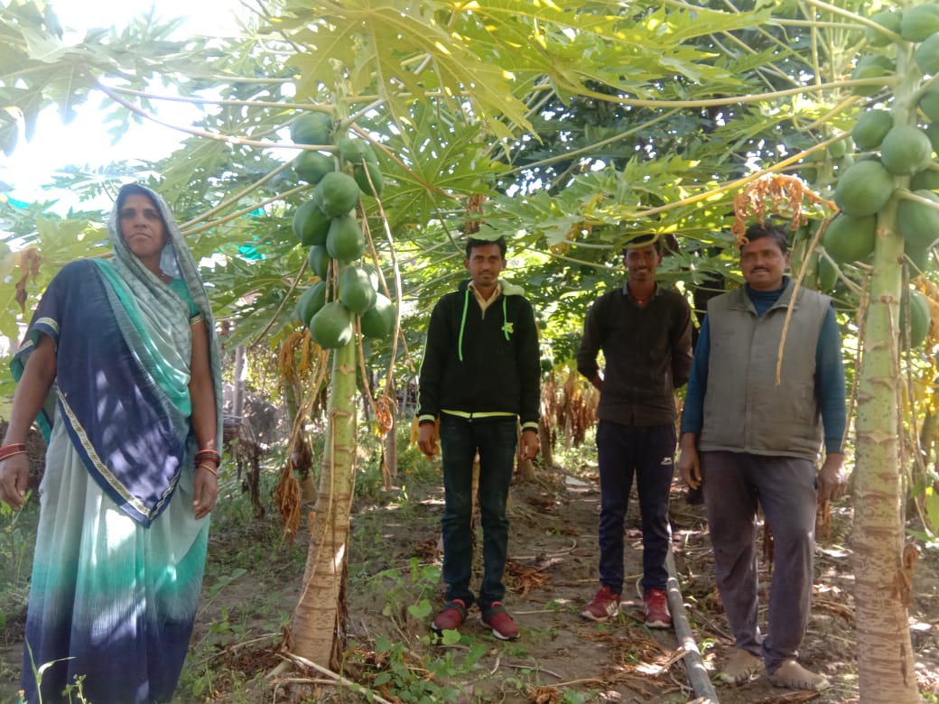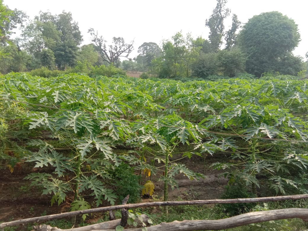 Under the joint guidance of SAFBIN team and district horticulture department, small-scale papaya cultivation has started with 20 small farms with 1301 plants. Moti Patel is one of them who has planted 350 papaya plants in his small farms. Moti Patel lives in Hanumantora village with his family. He was oriented on nursery raising, improved way of cultivation practices with integrated pest and nutrient management. Since Smallholder Adaptive Farming and Biodiversity Network promotes the smallholder led approaches, it was decided to have a mix of varieties Taiwan red lady and desi.