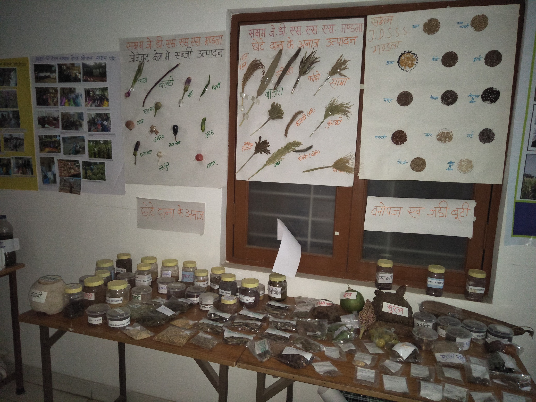 IEC materials including leaflets, brochures, banners, booklets, photo collage etc developed by the partners were displayed on programme registers, organic preparations like organic manure, organic pesticides, vermin-compost, model plots of mixed cropping, multi cropping, models of bio-gas unit-Deenbandhu model, vermin-compost pit, Kothi (seed bank/ grain bank), cow shed etc. along with local varieties of millets, vegetables, INM and IPM products.