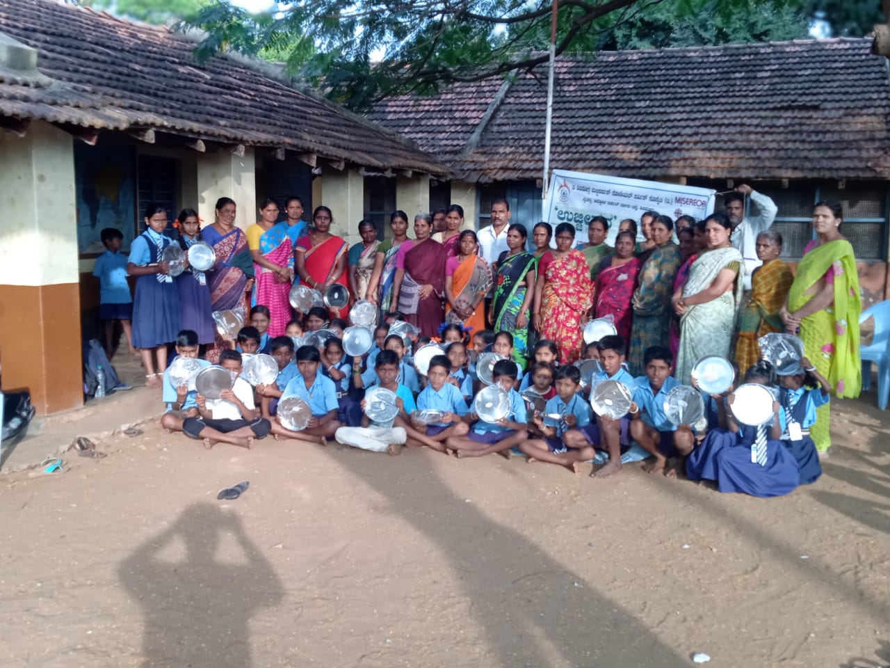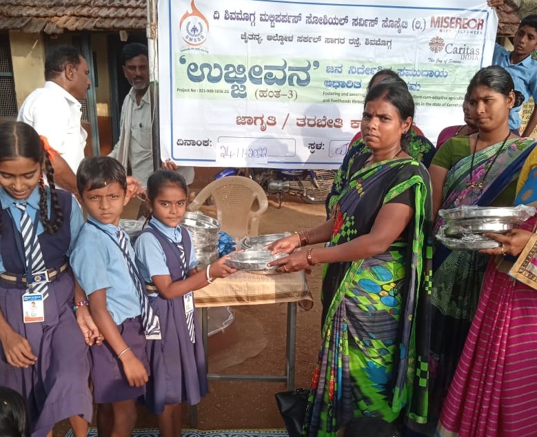 During the reopening of the Schools in July 2022, SMSSS, Shivamogga with the support of its animators, distributed notebooks and stationaries among 108 students at Higher Primary School, Masadi near Shivmoga. The school is situated in a remote village where children from poor households seek basic education. During the visit, the school head told the coordinators from SMSSS about the shortage of steel plates required to feed mid-day meals to children.
