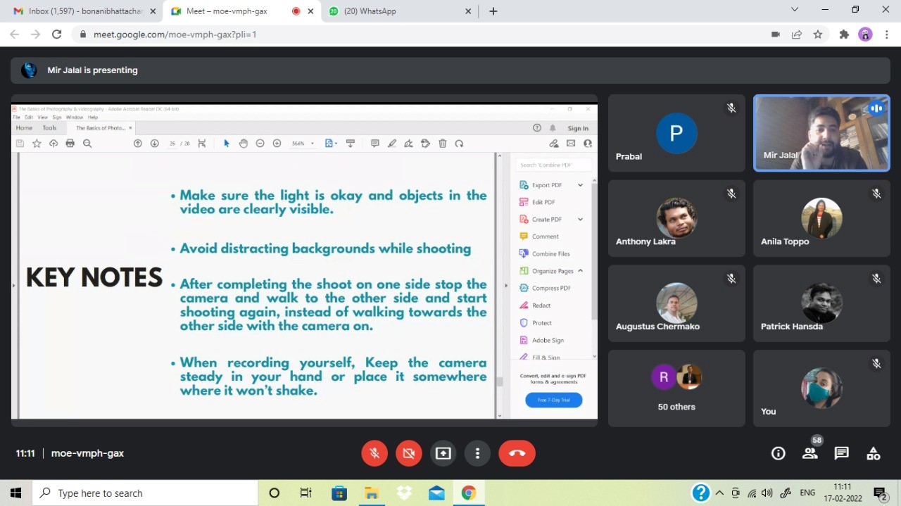A virtual training session was organised on Thursday, 17th February 2022 to train the on-ground program team on the basics of photography and videography. The entire session lasted for two hours and was divided into two parts including training and a small exercise along with assessment.