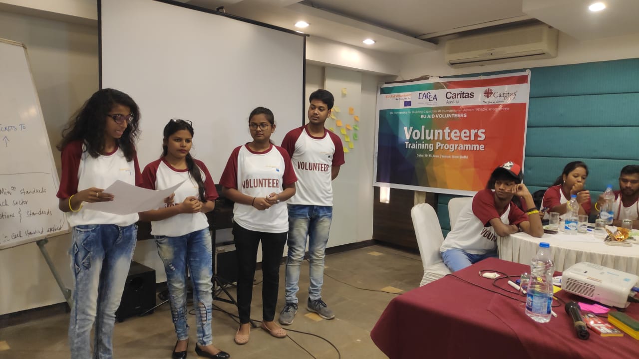 The second and third day of the training, the participants were oriented on Sphere Standards including Humanitarian Charter, Core Humanitarian Standards and Protection Principals to be practiced during Humanitarian Aid as a volunteer with Caritas India. At the end of second day volunteers visited ROPIO Foundation as part of their exposure visit. Volunteers conducted poster making workshop for children from classes 6-8 by making them aware on water conservation; for students of class 9 and above interactive session on sex education was led by the volunteers. The exposure visit ended with volunteers preparing food for children and themselves and sharing the meal together.