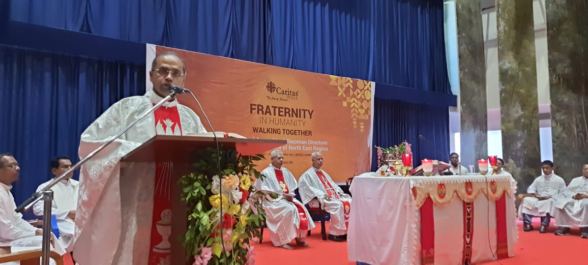 Caritas India as part of her journey towards embracing the 60th year of her existence organized its 2nd regional Assembly in the Northeast Region on 28th October 2021. The Assembly held at the magnanimous Silver Jubilee Memorial Hall of North East Diocesan Social Forum (NEDSSS) commenced with the Eucharistic Celebration presided by Most Rev. John Moolachira, Archbishop of Guwahati, President of NEIRBC, and Chairman of Regional Forum. Fr Dr Paul Moonjely, Executive Director of Caritas India welcomed the gathering and set the context of the day saying, ‘We are at a threshold to reflect and contemplate on the years traversed together along with our diocesan partners and other stakeholders in the pursuit of integral development and nation-building’.