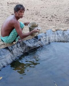 The water irrigation problem of Chunu was discussed with the staff of SWI and Mr. Parimal Kisku one of the Community Educators from SWI organisation who recommended the initiative for water conservation. He suggested the construction of an artificial pond where water can be collected through a low-cost method i.e., by digging a pit and covering it with a polythene sheet to store water. In this way, water can be stored for 4/5 days thus capacitating Chunu to cultivate crops or vegetables in the small piece of land he holds.