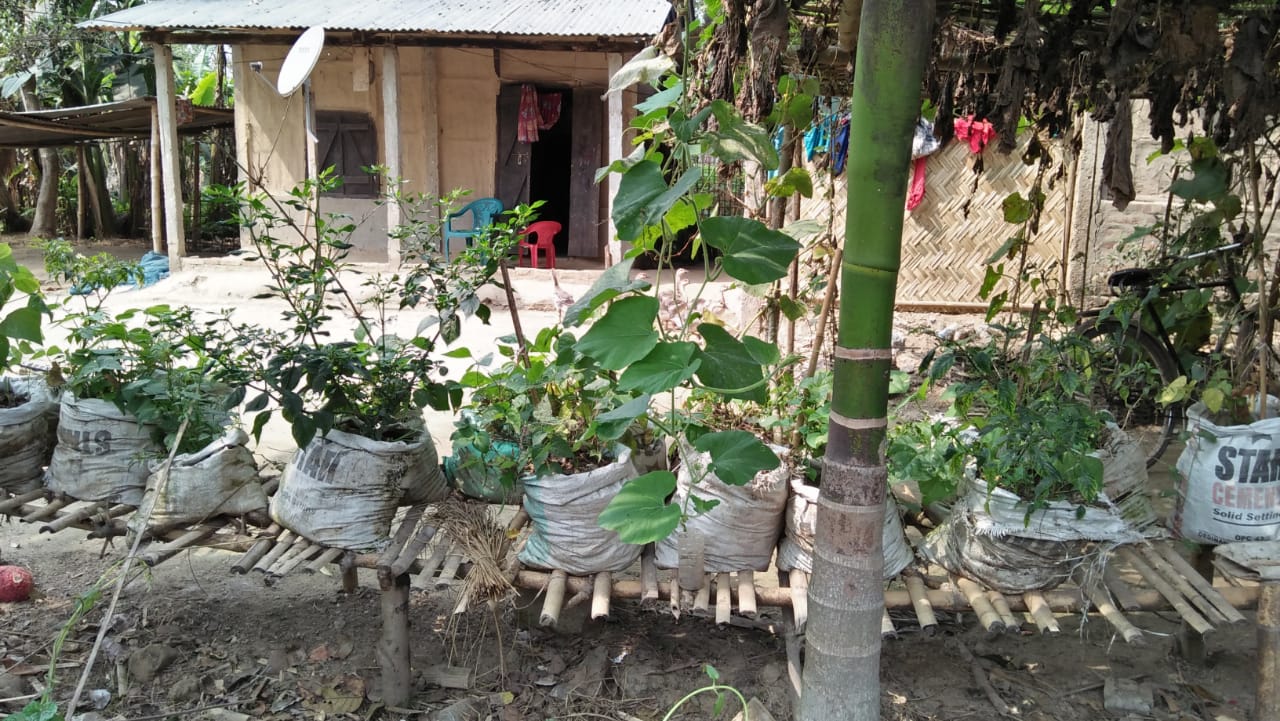 Nutritional gardens on a raised platform is gathering popularity in the flood prone areas of Dhemaji, Lakhimpur and Bishwanath. Women grow seasonal vegetables such as  brinjal, beans, coriander, chilly along with a variety of gourds, legumes and greens on cement bags and tubs which are then perched atop the chang-ghar. In places devoid of stilt houses, these bags are raised on a make-shift bamboo stilt with a height depending on the water level.