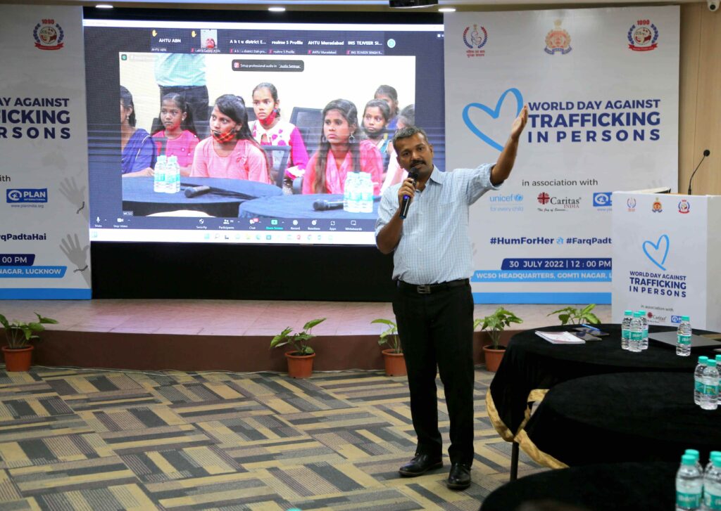 In North, Caritas India and its Swaraksha Anti-Human Trafficking partners joined hands with Women and Child Safety Organization (WCSO), UNICEF, Plan India and like-minded NGOs to observe the day with children who are vulnerable and are at the risk of being trafficked. The objective of including the children on this day was to make them aware on the use of technology in post covid era. The event was conducted under the leadership of Additional Director General of Police for women and Child safety in Uttar Pradesh, Ms. Neera Rawat. She interacted with the children and informed that the menace of human trafficking spoils the lives of little children who miss their childhood as they become a victim of human trafficking.